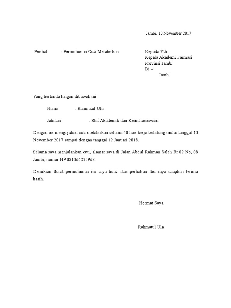 Tak hanya perempuan yang bisa mengajukan cuti, para suami pun bisa cuti sementara ketika istri hendak melahirkan. Contoh surat cuti melahirkan untuk karyawan. Surat permohonan cuti melahirkan perangkat desa adalah surat permohonan yang diajukan oleh seorang perangkat desa kepada kepala desa untuk memohon diberi cuti melahirkan. Mengajukan surat cuti kerja karena sudah hamil 7 bulan di. Waktu pada cuti melahirkan jauh lebih lama dibandingkan cuti lainnya, seperti surat cuti menikah yang hanya beberapa hari saja.
